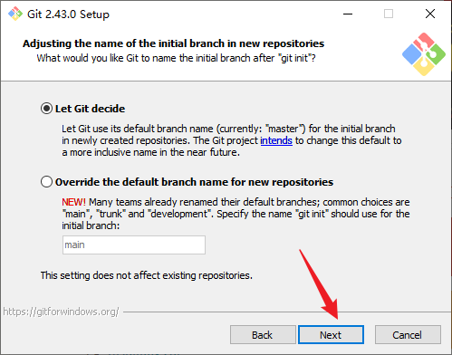 7. 设置新仓库初始分支的名字,按照系统默认选择Let Git decide(让Git自己决定),完成后点击Next:
