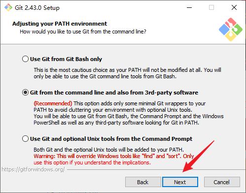 8. 调整环境变量,按照系统推荐选择Git from the commond line and alos from 3rd-party software,点击Next: