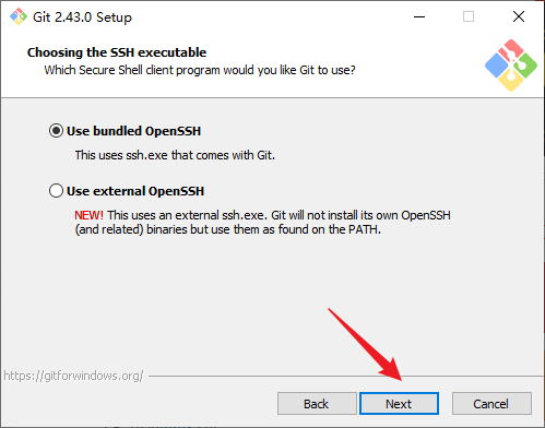 9. 选择可执行的SSH工具,这里按照默认勾选Use bundled OpenSSH(使用Git自带的SSH工具),点击Next: