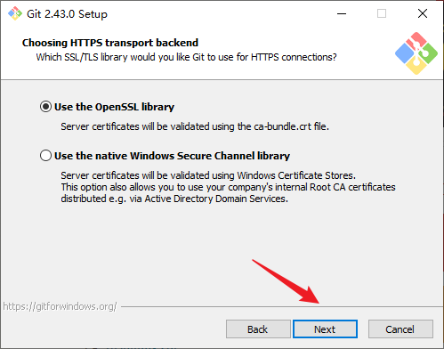 10. 选择HTTPS连接时,Git使用的是SSL还是TLS库,这里按照系统默认勾选Use the OpenSSL library,点击Next: