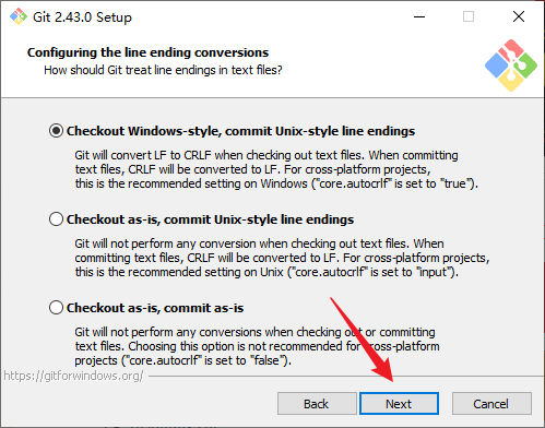 11. 换行风格选择,按照系统默认勾选Checkout Windows-style, commit Unix-style line endings: