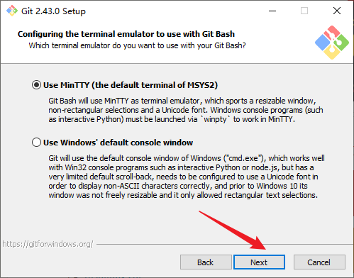12. 按照系统默认勾选Use MinTTY(the default terminal of MSYS2),点击Next: