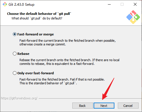 13. 配置从服务器拉取代码的默认操作,按照系统默认勾选Fast-forward or merge,点击Next:
