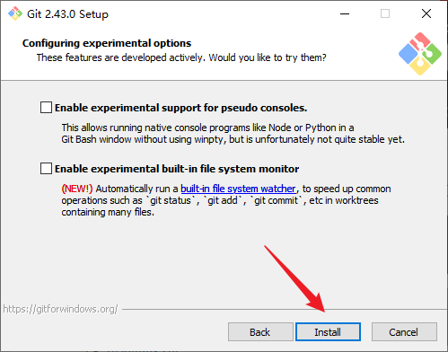 16. 配置实验性选项,这里全部不勾选,点击Install开始安装: