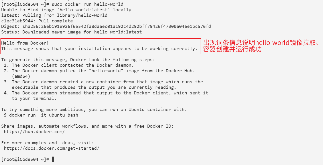 这个命令在执行时,会先拉取hello-world镜像,下载完成后会创建一个容器,此时 Docker 会运行这个容器并在控制台输出结果: