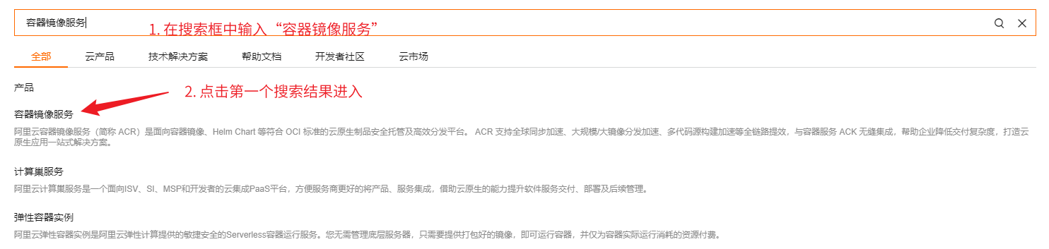 2. 登陆后,在主页面搜索容器镜像服务,点击进入: