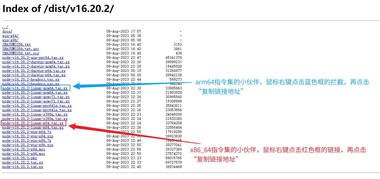 3. 根据前面的指令集下载对应的安装包,由于我的 Linux 是 x86_64 指令集,因此需要鼠标点击下图的红色框链接再点击复制链接: