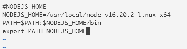 7. (当前位置:窗口 2)将光标移动到第二行,将NODEJS_HOME对应的值替换成第 6 步复制的路径。完成后按一下Esc键,然后输入:wq保存并退出。