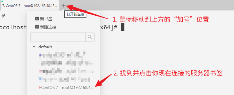 1. 鼠标移到上方的加号位置,找到你现在所连接的服务器,再开启一个窗口: