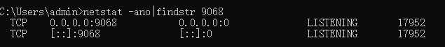 这里我要关闭的是9068号端口,执行后得到两个结果,最右侧的一列就是进程的PID,这里我需要关闭PID是17952对应的进程: