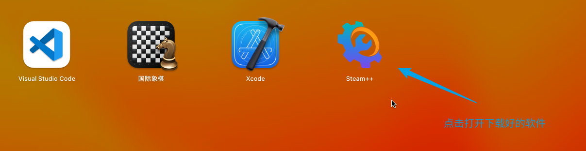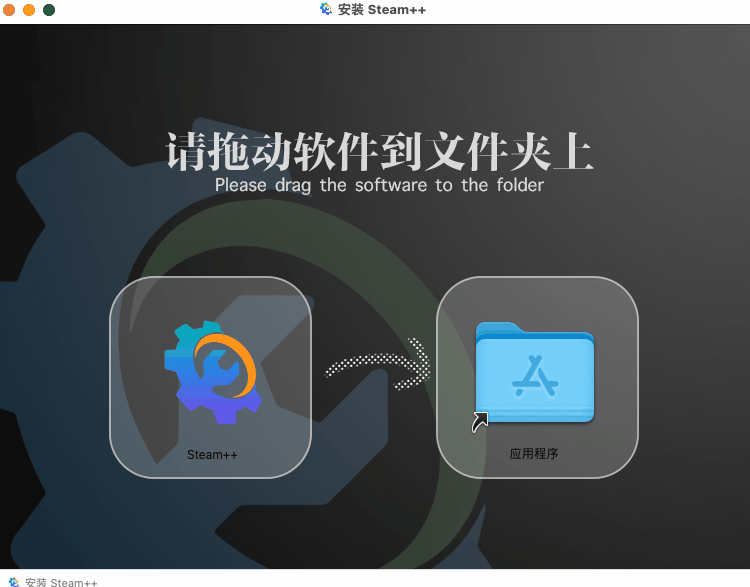8. 双击打开安装包,按照下图所示操作,将Steam++拖入到应用程序: