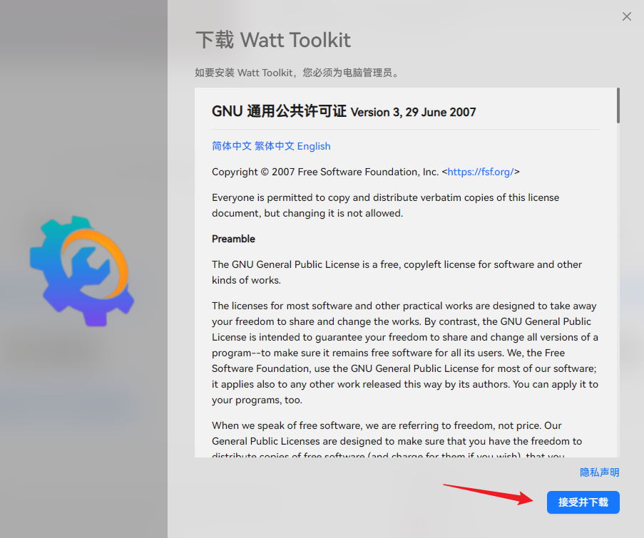 3. 此时会弹出一个 GNU 通用公共许可证协议,点击右下角接受并下载: