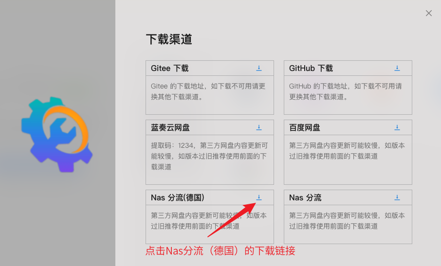 4. 官方为我们提供多个下载渠道,这里我点击左下角Nas分流(德国)下载链接: