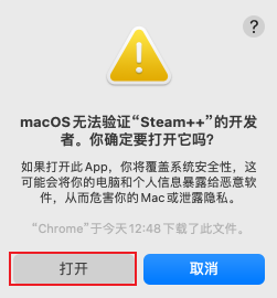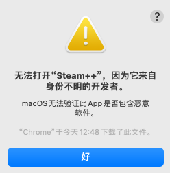 10. 此时会系统会弹出一个错误:无法打开“Steam++”,因为它来自身份不明的开发者。点击窗口下方好: