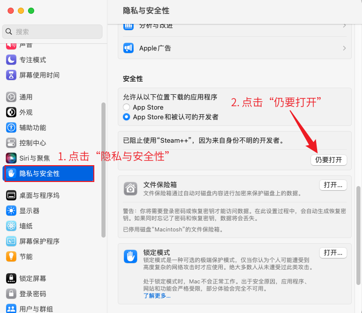 12. 点击左侧隐私与安全性,向下找安全性中有一个提示信息:已阻止使用“Steam++”,因为它来自身份不明的开发者。点击提示信息下方的仍要打开: