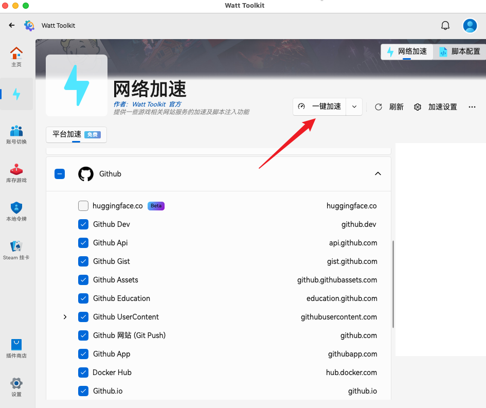 17. 切回到Watt Tookit,点击一键加速,此时Github的加速已经成功开启: