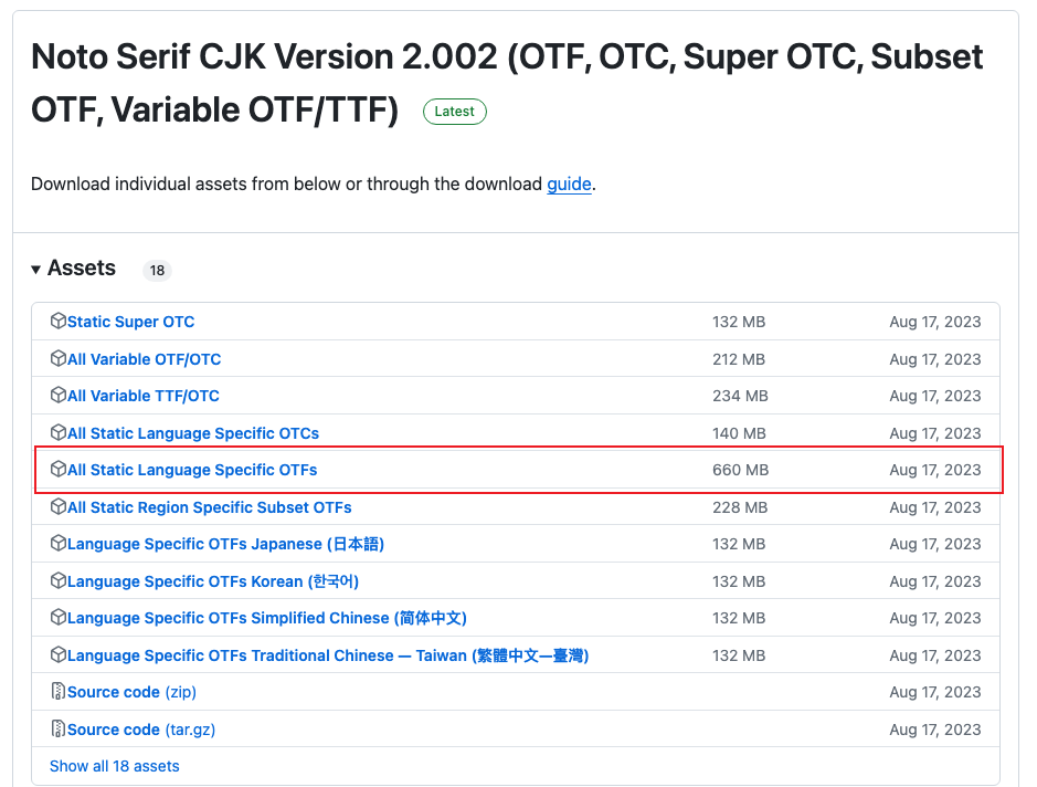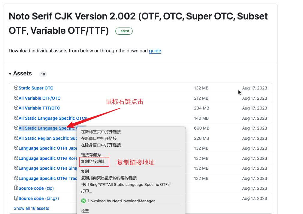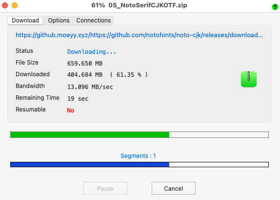 这里我想下载 Google 家的 Noto Serif 全语言字体包(点我查看源网站),文件大小 600M 左右,如果正常使用浏览器下载非常慢,接下来我们就使用 NDM+Github 加速网站解决上述问题。