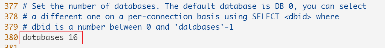 Redis 默认有 16 个数据库,编号范围是[0, 15],在 Redis 配置文件 redis.conf 中有相应配置可以作证上述说法: